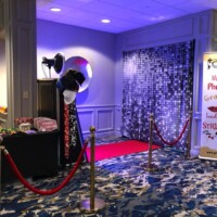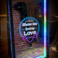 Enchanted Magic Mirror Photo Booths: Regular price: $699 for up to 3 hours of digital service. A booth attendant will provide transport, set up/tear down and troubleshooting, if needed. Unlimited photo sessions for all guests will be available during your rental time, and a full supply of sign props is also provided in every package. All events will receive a digital copy of all photos taken from the night via a download link provided to download all photo copies of your rental to a personal device of your choice. Backdrop options can be added as shown below on this page, as well as upgrading to printed photos on site with a memory book, if desired. With our Enchanted Mirror Booths, 3-4 adult guests will comfortably fit per session; our record number has been 25 “carefully arranged” bodies into one photo! Your guests will be treated to a high-end, full color, interactive experience with “red carpet” treatment leading to an aesthetically pleasing attractive display. The Enchanted Mirror Booth is completely touch screen and guest interactive.